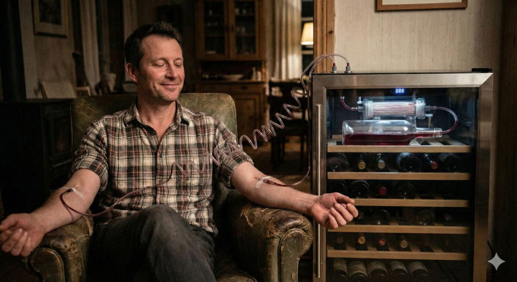 By connecting two needles for a full loop, the cooler can act as a dialyzer to remove alcohol from your bloodstream. It will then tap the concentrated alcohol into bottles, labelled and stored in the cooler for later use. Enjoy a good night’s sleep and wake up fresh the next morning! You can then reconnect the machine to have your alcohol reinfused. In this way minimal alcohol goes to waste, and those expensive wines will last even longer.